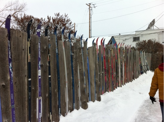 壁がスキーの板で埋め込まれています(笑)